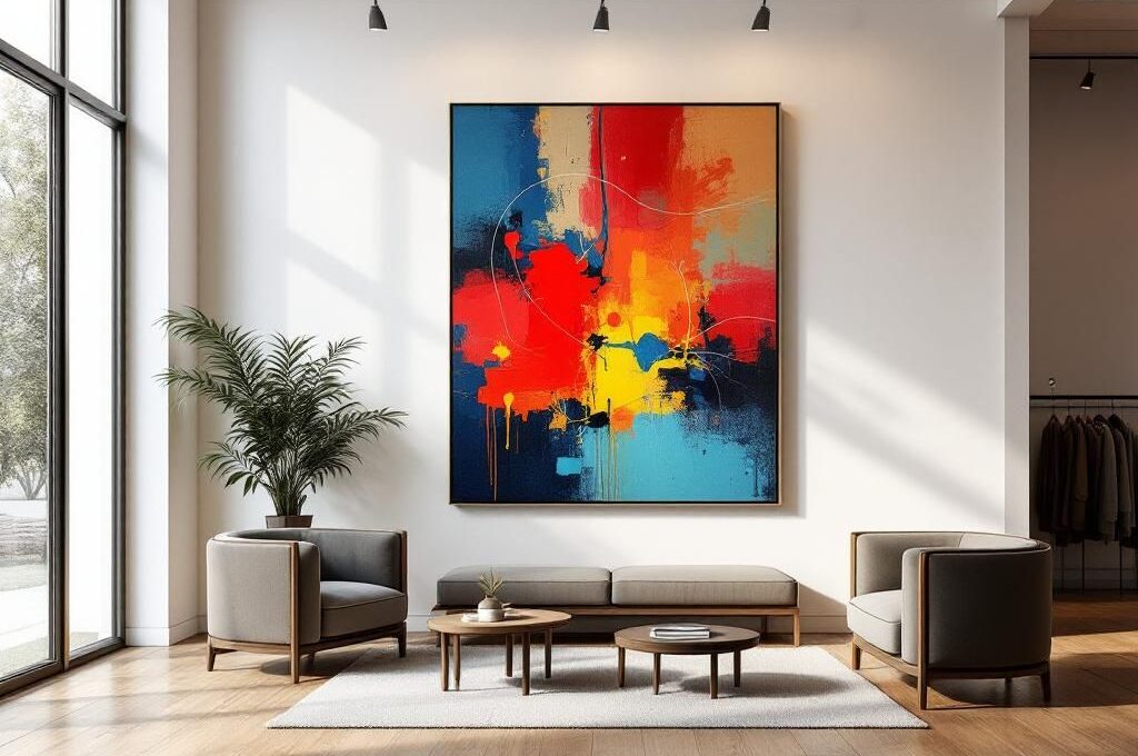 Pour un salon, privilégiez des formats généreux de 80 à 120 cm de largeur qui créeront un point d’attraction visuelle au-dessus du canapé ou de la cheminée. Les chambres accueillent idéalement des oeuvres de 40 à 60 cm, favorisant la sérénité. Dans un bureau, optez pour des formats moyens de 50 à 70 cm qui stimulent la créativité sans distraire.