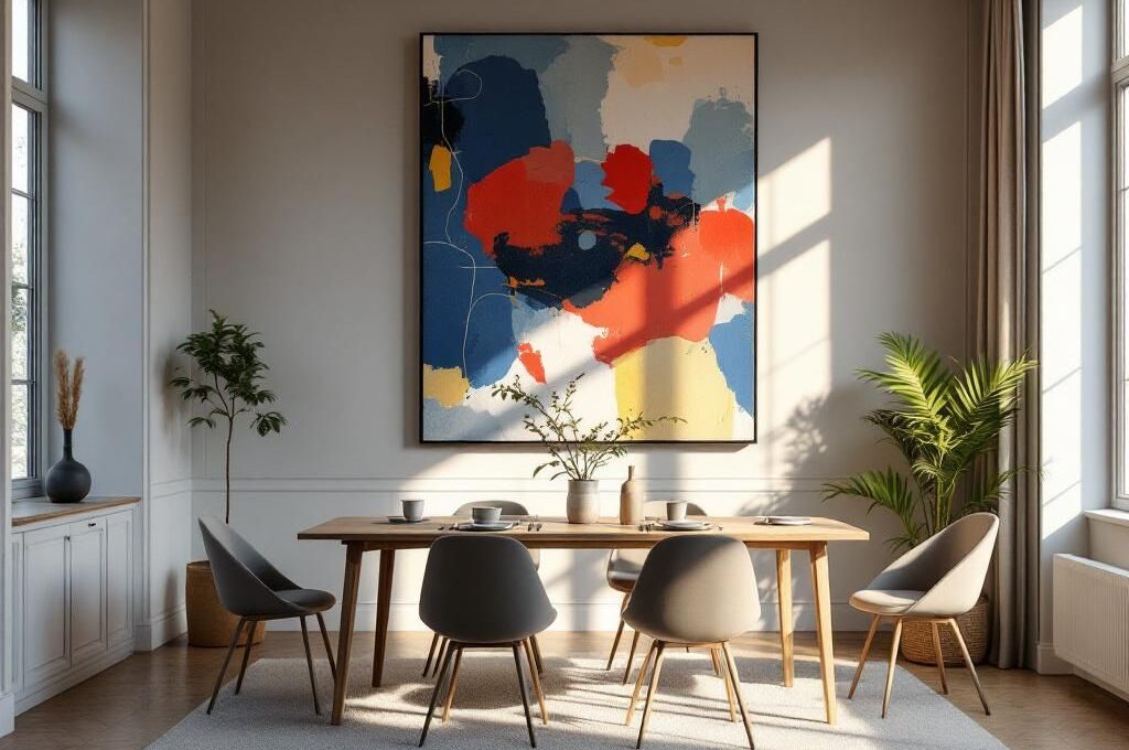 La peinture abstraite transforme radicalement l’ambiance d’une salle à manger grâce à sa capacité d’expression pure. Les compositions géométriques aux lignes épurées s’harmonisent parfaitement avec les intérieurs modernes et scandinaves, créant un dialogue visuel sophistiqué avec le mobilier contemporain. L’expressionnisme abstrait apporte quant à lui une dimension émotionnelle intense, particulièrement adaptée aux décorations industrielles où les couleurs vibrantes contrastent avec les matériaux bruts comme l’acier et le béton.